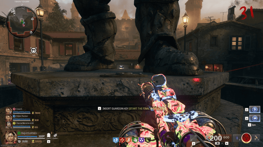 You’ve entered The Guardian’s Territory now. A solid setup to run would be 1 Bullet Based Weapon, possibly bring the Mustang & Sally as your secondary. Also, bringing a sword definitely wouldn’t hurt. Make sure you have all the perks you need, a self-revive, as well as Tier 3 Pack & Legendary Rarity on your guns. Bringing in a lot of points also helps if you need to buy ammo.
