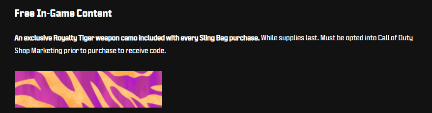 This item is ONLY available from the Official Call of Duty Shop. Meaning you will NEED to buy the bag from Call of Duty ONLY to receive a code for the Royalty Tiger Camo. The bag is priced at 60$ USD and when purchased; you’ll not only receive the sling bag that’s TF-141 themed with a topography pattern, but you’ll also receive a code through an email that’ll allow you to obtain the camo!